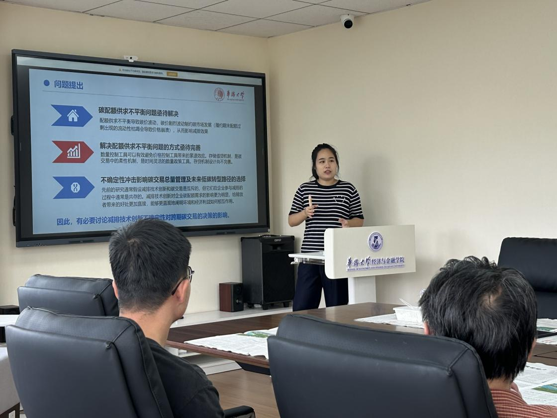 会议伊始,傅联英教授担任主持。随后,齐小源博士就企业减排能力差异作为出发点展开深入且细致的讲解,从分析碳市场供求关系,到提出对中国碳市场的研究必要性。同时,从解决碳配额供求不平衡的问题提出,到回顾文献总结已有研究不足,再到巧妙设计研究方法,针对不同问题设计相应模型求解。最后,齐小源博士以完善存贷机制为手段解决碳配额供求不平衡问题的创新视角,总结了本研究对于环境与经济方面的意义,表达了对未来碳市场发展的展望。