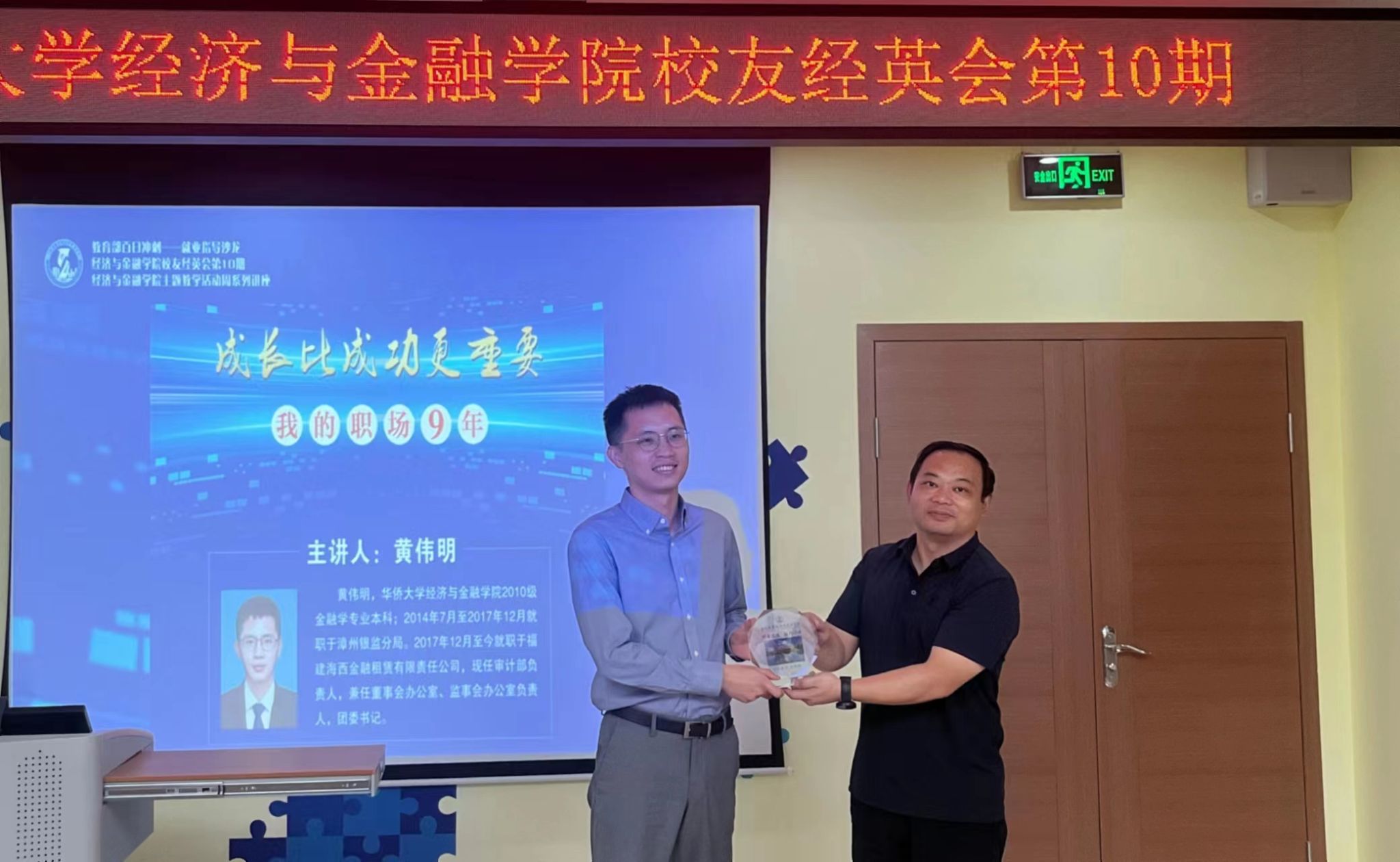 本次交流分享会共两个环节。第一环节为聘任仪式,由黄建烽书记为黄伟明学长颁发太阳集团tcy8722校外辅导员、中国太阳集团tcy8722校友经英会主讲嘉宾证书。活动进入第二环节,黄伟明学长结合人生所经历的两个重要职业阶段为向大家分享了他的成长感悟。第一个阶段为面临不同职业选择的大四毕业时期。在分析了公务员、金融机构、考研、国企这四个不同的人生去向选择后,学长表示同学们在选择时应综合职业发展,个人情况,薪资待遇等多种因素。同时,学长强调同学们在进行职业生涯规划时,应该构建自己的基本画像,以便对自己的性格能力、目标理想、自身条件有基本的概念,通过在试错成本较低的大学时期积极进行实践实习,完善自己的职业设定。随后,学长向大家分享了他的第二个职业阶段,即由政府单位转向为金融机构。在这个阶段,学长表示职业生涯的第一个工作平台应尽可能更高,以确保将来的职业生涯发展更加顺利。注重平台选择,才能拥有广阔的职业发展道路,做到“职场后地每次跳槽都应是上升路”。最后,学长提出了实现职业发展所必需的四个素养,即学习、专注、自律及融入。