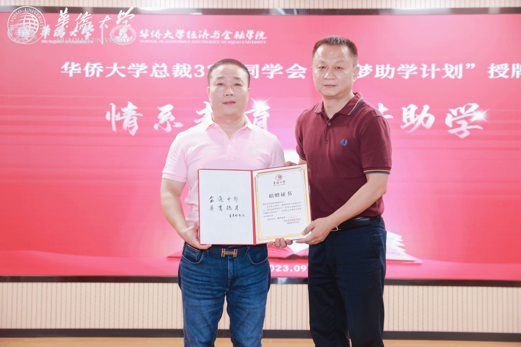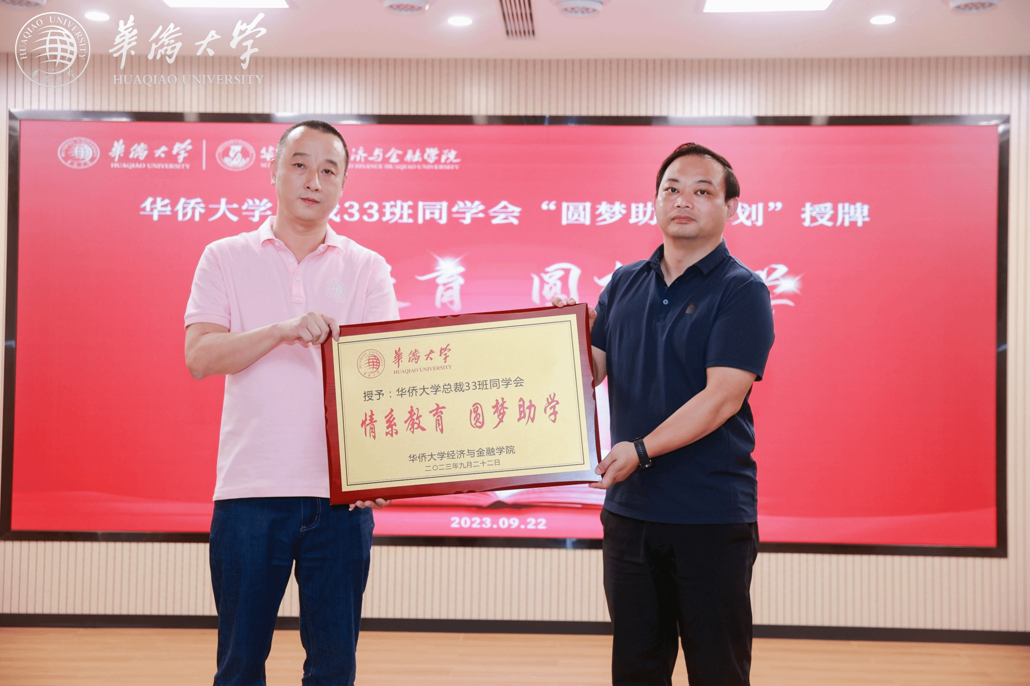 仪式上,33班同学会会长刘永平表示,希望以捐资助学的方式回报母校,为教育事业尽一份绵薄之力。未来,也将一如既往、力所能及地给予母校学子更多的支持和帮助,也祝愿有更多的优秀大学生进入到大学象牙塔。随后,校友办副主任康振辉向33班同学会颁授捐赠证书;学院党委书记黄建烽向33班同学会颁授“情系教育,圆梦助学”牌匾。