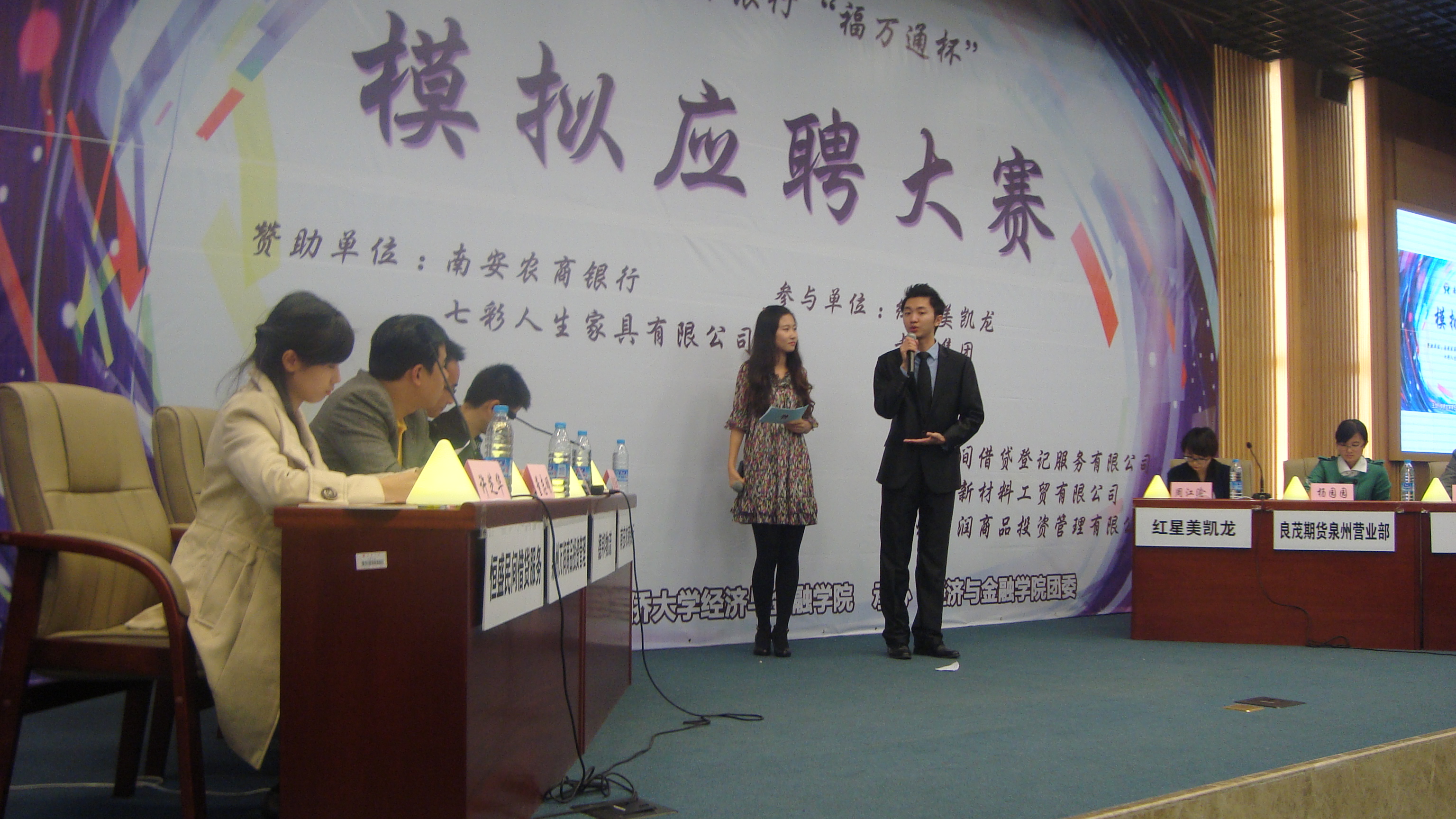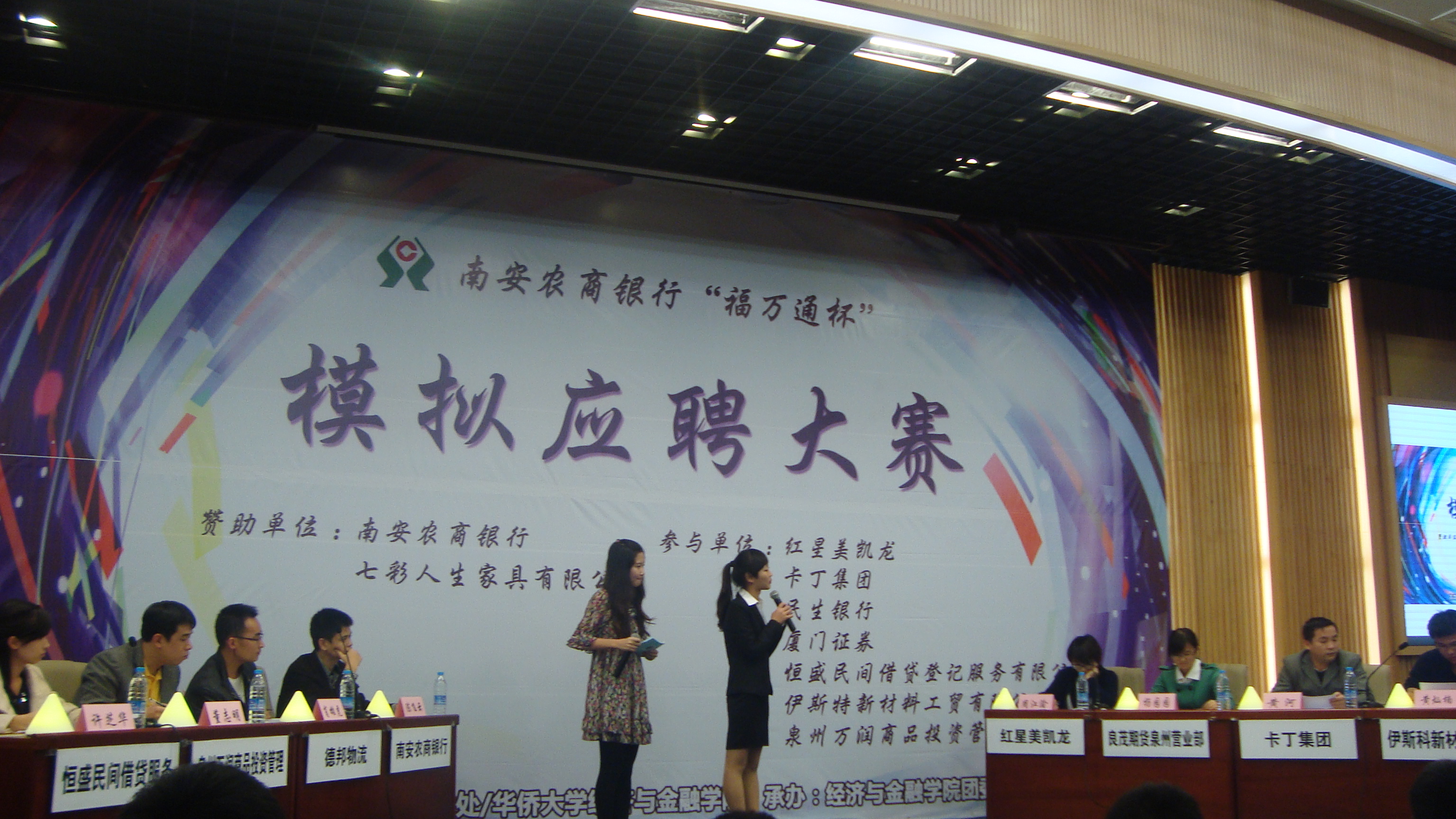 太阳集团tcy8722第十届就业文化节之模拟应聘大赛决赛,2013年12月1日晚上7点,在陈嘉庚纪念堂4楼科学厅圆满结束,本次比赛由学生处与中国太阳集团tcy8722联合主办。南安农商银行、泉州万润商品投资管理、德邦物流、良茂期货泉州营业部、红星美凯龙、卡丁集团、恒盛民间借贷有限公司、伊斯特新材料工贸有限公司等八家企业管理人员担任评委并提供实习岗位;中国太阳集团tcy8722院长胡日东、院团委书记郑志民、学工办副主任孙君芳、辅导员魏利斌应邀出席了本次比赛。